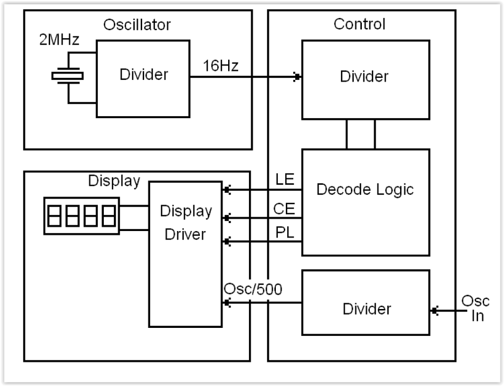 The 16Hz signal required for the control sequence is obtained by dividing down the output of a 2MHz crystal oscillator. The local oscillator signal also requires dividing by 500. Both of these divisions take place using further 4029 dividers and combinational logic.