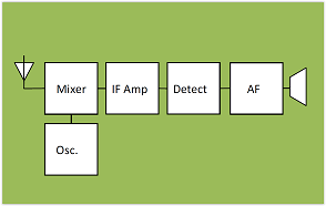 The figure above shows a block diagram of a superhet receiver. In a domestic set, a ganged variable tuning capacitor maintains the frequency of the oscillator at a fixed value above the wanted input signal.