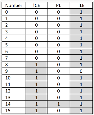 We accomplish the sequence by feeding a 16Hz clock into another 4029, this time configured as a 16-stage counter. We decide in which of the 16 states that we want the above four steps to happen, then use combinational logic to generate the Preload, Count Enable and Latch Enable signals.